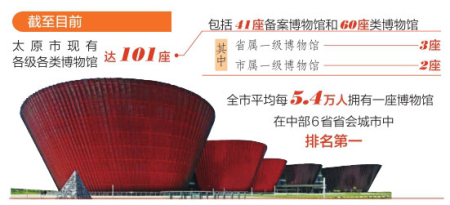 太原市充分發(fā)揮文物資源優(yōu)勢,將博物館作為文物保護(hù)利用改革的突破口,傾力建設(shè)凸顯地方文化特色的“博物館之城”。截至目前,太原市現(xiàn)有各級各類博物館達(dá)101座,包括41座備案博物館和60座類博物館,其中省屬一級博物館3座、市屬一級博物館2座。全市平均每5.4萬人擁有一座博物館,在中部6省省會城市中排名第一,遠(yuǎn)超全國平均水平。