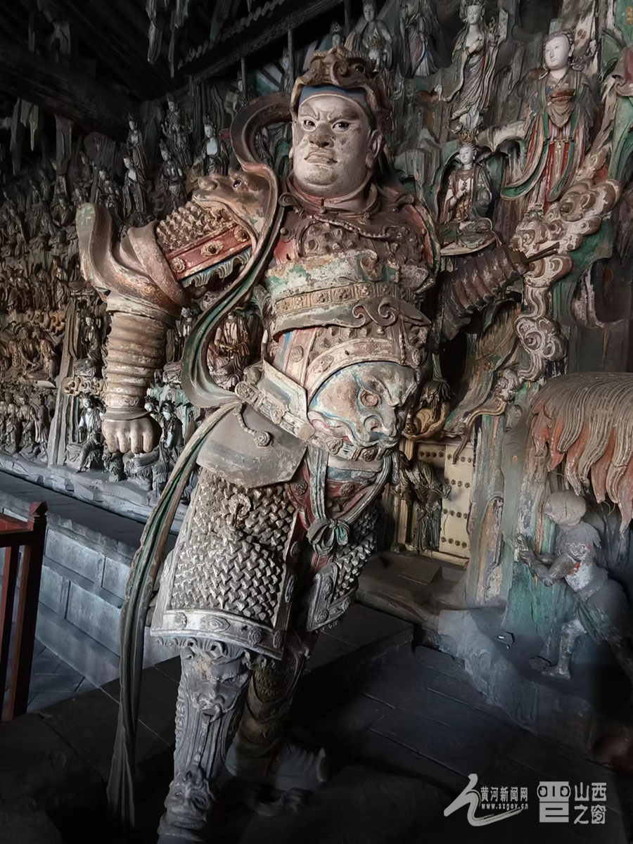 寺內(nèi)擁有總計2000多尊彩塑,大者丈余、小者尺許,每一壁龕為一獨立神話或佛教故事,人物造型生動,神態(tài)逼真,尤其以“千手觀音像”與“韋馱像”最為經(jīng)典。舞蹈《千手觀音》的靈感原型就是這尊千手觀音像。塑像高達數(shù)米,全身貼金,背后伸出上千只手臂,每只手掌上都有一只眼睛,錯落有致,整個造像氣勢恢宏,達到雕塑藝術(shù)中和諧、完美的境界。韋馱像巍然肅立,身披甲胄,神情凝重,整個身體呈現(xiàn)出一種微妙的動態(tài)平衡,是明代彩塑中少見的藝術(shù)杰作,被譽為“天下第一韋馱”“全國韋馱之冠”。景區(qū)講解員侯麗娟介紹:“這尊塑像的高明之處就在于匠師不落俗套,打破了一般程式的限制,賦予了韋馱一種時間的節(jié)奏性和動作的連續(xù)性,產(chǎn)生了雕塑作品的最高境界‘不動之動’?!?/p>