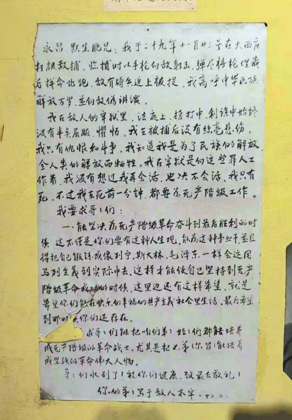 在此彌留之際,我以畢生至誠(chéng)敬謹(jǐn)請(qǐng)求入黨,請(qǐng)中共中央嚴(yán)格審查我的一生歷史,是否合格,如承追認(rèn)入黨,實(shí)平生之大愿也,專此謹(jǐn)致布爾塞維克的敬禮!