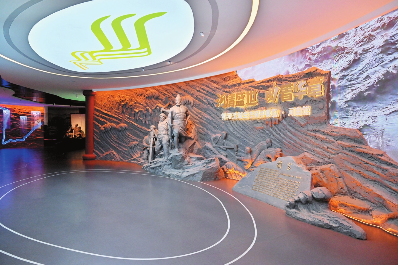 在第五篇章“大河之夢(mèng)·生態(tài)和諧”展區(qū)的弧幕影院里,《河清盛世曲著華章》主題影片展現(xiàn)著新時(shí)代圖景:國(guó)家園林縣城的林蔭道上,光伏板與古長(zhǎng)城交相輝映;黃河濕地公園里,黑鸛與白天鵝掠過水面;整溝治理后的山坡上,民宿集群飄起裊裊炊煙。