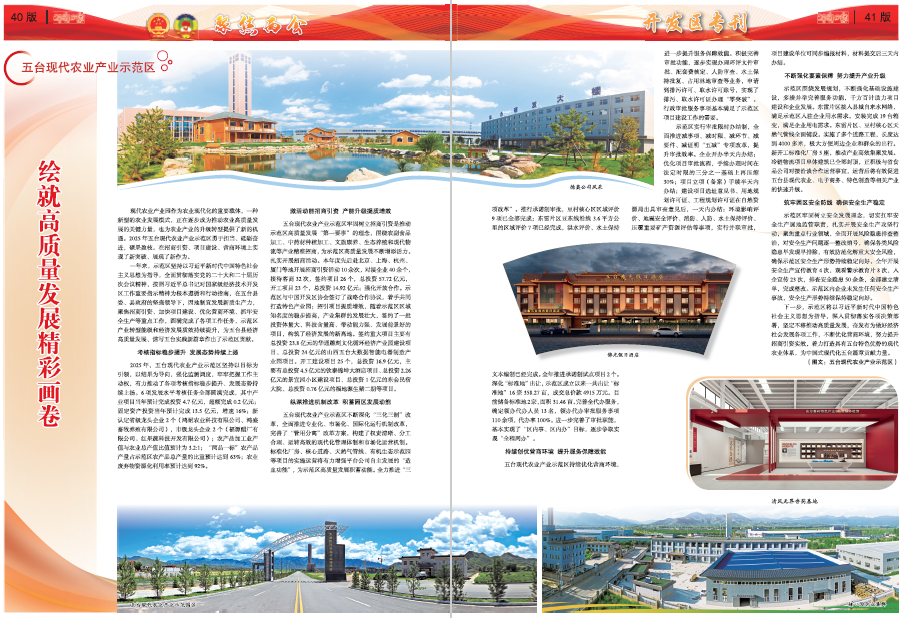 繪就高質(zhì)量發(fā)展精彩畫卷 現(xiàn)代農(nóng)業(yè)產(chǎn)業(yè)園作為農(nóng)業(yè)現(xiàn)代化的重要載體,一種新型的農(nóng)業(yè)發(fā)展模式,正在逐步成為推動農(nóng)業(yè)高質(zhì)量發(fā)展的關(guān)鍵力量,也為農(nóng)業(yè)產(chǎn)業(yè)的升級轉(zhuǎn)型提供了新的機遇。2025年五臺現(xiàn)代農(nóng)業(yè)產(chǎn)業(yè)示范區(qū)勇于擔當、砥礪奮進,碩果盈枝。在招商引資、項目建設(shè)、營商環(huán)境上實現(xiàn)了新突破、展現(xiàn)了新作為。 一年來,示范區(qū)堅持以習近平新時代中國特色社會主義思想為指導,全面貫徹落實黨的二十大和二十屆歷次會議精神,按照習近平總書記對國家級經(jīng)濟技術(shù)開發(fā)區(qū)工作重要指示精神為根本遵循和行動指南,在五臺縣委、縣政府的堅強領(lǐng)導下,因地制宜發(fā)展新質(zhì)生產(chǎn)力,聚焦招商引資、加快項目建設(shè)、優(yōu)化營商環(huán)境、抓牢安全生產(chǎn)等重點工作,圓滿完成了各項工作任務,示范區(qū)產(chǎn)業(yè)轉(zhuǎn)型能級和經(jīng)濟發(fā)展質(zhì)效持續(xù)提升,為五臺縣經(jīng)濟高質(zhì)量發(fā)展、譜寫五臺實踐新篇章作出了示范區(qū)貢獻。 考核指標穩(wěn)步提升發(fā)展態(tài)勢持續(xù)上揚 2025年,五臺現(xiàn)代農(nóng)業(yè)產(chǎn)業(yè)示范區(qū)堅持以目標為引領(lǐng),以結(jié)果為導向,強化監(jiān)測調(diào)度,牢牢把握工作主動權(quán),有力推動了各項考核指標穩(wěn)步提升、發(fā)展態(tài)勢持續(xù)上揚。6項發(fā)展水平考核任務全部圓滿完成,其中產(chǎn)業(yè)項目當年預計完成投資4.7億元,超額完成0.2億元;固定資產(chǎn)投資當年預計完成13.5億元,增速16%;新認定省級龍頭企業(yè)2個(鴻耐農(nóng)業(yè)科技有限公司、鴻盛畜牧養(yǎng)殖有限公司),市級龍頭企業(yè)2個(福源醋廠有限公司、紅果蔬科技開發(fā)有限公司);農(nóng)產(chǎn)品加工業(yè)產(chǎn)值與農(nóng)業(yè)總產(chǎn)值比值預計為3.2:1;“兩品一標”農(nóng)產(chǎn)品產(chǎn)量占示范區(qū)農(nóng)產(chǎn)品總產(chǎn)量的比重預計達到63%;農(nóng)業(yè)廢棄物資源化利用率預計達到92%。 激活動能招商引資產(chǎn)能升級提質(zhì)增效 五臺現(xiàn)代農(nóng)業(yè)產(chǎn)業(yè)示范區(qū)牢固樹立招商引資是推動示范區(qū)高質(zhì)量發(fā)展“第一要事”的理念,圍繞農(nóng)副食品加工、中藥材種植加工、文旅康養(yǎng)、生態(tài)養(yǎng)殖和現(xiàn)代物流等產(chǎn)業(yè)精準招商,為示范區(qū)高質(zhì)量發(fā)展不斷增添活力。扎實開展招商活動。本年度先后赴北京、上海、杭州、廈門等地開展招商引資活動10余次,對接企業(yè)40余個,接待客商32次,簽約項目26個,總投資57.72億元,開工項目23個,總投資14.92億元;強化開放合作。示范區(qū)與中國開發(fā)區(qū)協(xié)會簽訂了戰(zhàn)略合作協(xié)議,著手共同打造特色產(chǎn)業(yè)園;招引項目提質(zhì)增效,隨著示范區(qū)區(qū)域知名度的穩(wěn)步提高,產(chǎn)業(yè)集群的發(fā)展壯大,簽約了一批投資體量大、科技含量高、帶動能力強、發(fā)展前景好的項目,構(gòu)筑了經(jīng)濟發(fā)展的新高地。簽約重大項目主要有總投資23.8億元的華通雕刻文化循環(huán)經(jīng)濟產(chǎn)業(yè)園建設(shè)項目、總投資24億元的山西五臺大數(shù)據(jù)智能電器制造產(chǎn)業(yè)園項目。開工建設(shè)項目25個,總投資16.9億元,主要有總投資4.5億元的欽泰錦坤大酒店項目、總投資2.26億元的景宜園小區(qū)建設(shè)項目、總投資1億元的東會民宿大院、總投資0.76億元的福地源生豬二期等項目。 縱深推進機制改革積蓄園區(qū)發(fā)展動能 五臺現(xiàn)代農(nóng)業(yè)產(chǎn)業(yè)示范區(qū)不斷深化“三化三制”改革,全面推進專業(yè)化、市場化、國際化運行機制改革,完善了“管用分離”改革方案,構(gòu)建了權(quán)責清晰、分工合理、運轉(zhuǎn)高效的現(xiàn)代化管理體制和市場化運營機制。標準化廠房、核心道路、天然氣管線、有機生態(tài)示范園等項目的實施運營將有力增強平臺公司自主發(fā)展的“造血功能”,為示范區(qū)高質(zhì)量發(fā)展積蓄動能。全力推進“三項改革”。推行承諾制審批,豆村核心區(qū)區(qū)域評價9項已全部完成;東雷片區(qū)豆東線沿線3.6平方公里的區(qū)域評價7項已經(jīng)完成,洪水評價、水土保持文本編制已經(jīng)完成。全年推進承諾制試點項目2個。深化“標準地”出讓,示范區(qū)成立以來一共出讓“標準地”16宗358.27畝,成交總價款4915萬元。目前儲備標準地2宗,面積31.46畝。完善全代辦服務,確定領(lǐng)辦代辦人員13名,領(lǐng)辦代辦審批服務事項110余項,代辦率100%。進一步完善了審批職能,基本實現(xiàn)了“區(qū)內(nèi)事、區(qū)內(nèi)辦”目標,逐步爭取實現(xiàn)“全程網(wǎng)辦”。 持續(xù)創(chuàng)優(yōu)營商環(huán)境提升服務保障效能 五臺現(xiàn)代農(nóng)業(yè)產(chǎn)業(yè)示范區(qū)持續(xù)優(yōu)化營商環(huán)境,進一步提升服務保障效能。積極完善審批功能,逐步實現(xiàn)辦理環(huán)評文件審批、配套費核定、人防審查、水土保持批復、占用林地審查等業(yè)務,申請到排污許可、取水許可賬號,實現(xiàn)了排污、取水許可